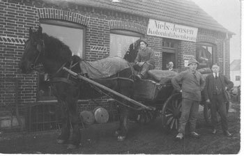 Købmand Jensen var dygtig og udviklede forretningen til en betydelig virksomhed, der blev kendt vidt omkring. På billedet ses købmanden stående i døren, til højre kommis Richard Jensen og kusk Jørgen Pedersne. Midtfor står en pakhuskarl. Hesten havde også et navn. Den blev kaldt "Klaus Købmand".